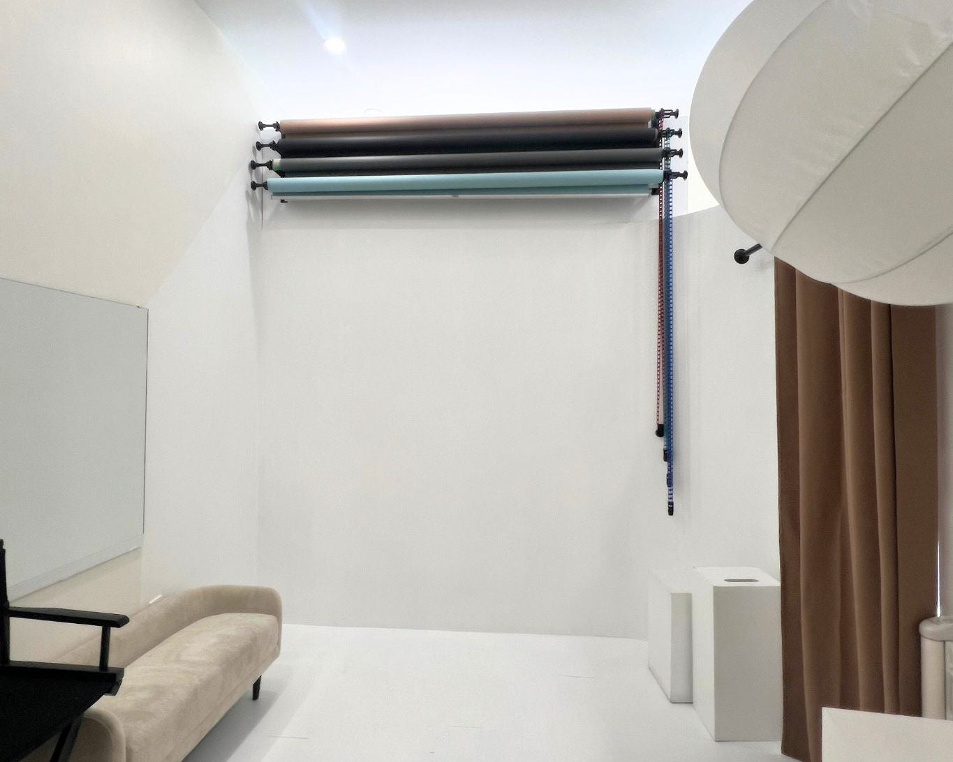 Our spacious ALL-IN-ONE studio room - Designed for full body, 3/4 body shots, and head shot portraits. You have the option to alternate between 4 backdrops throughout your session + the white wall. Perfect for solo, group and family photos, professional headshots, and more.